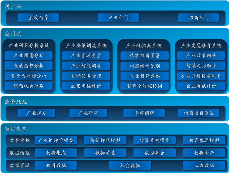 針對(duì)目前地方存在的產(chǎn)業(yè)分析缺乏全面性、產(chǎn)業(yè)招商缺乏精準(zhǔn)性,通過構(gòu)建全方位大數(shù)據(jù)底座和全環(huán)節(jié)數(shù)字化賦能,實(shí)現(xiàn)對(duì)地方產(chǎn)業(yè)工作從產(chǎn)業(yè)分析、到產(chǎn)業(yè)調(diào)度、產(chǎn)業(yè)招商、產(chǎn)業(yè)培育的全閉環(huán)支撐。