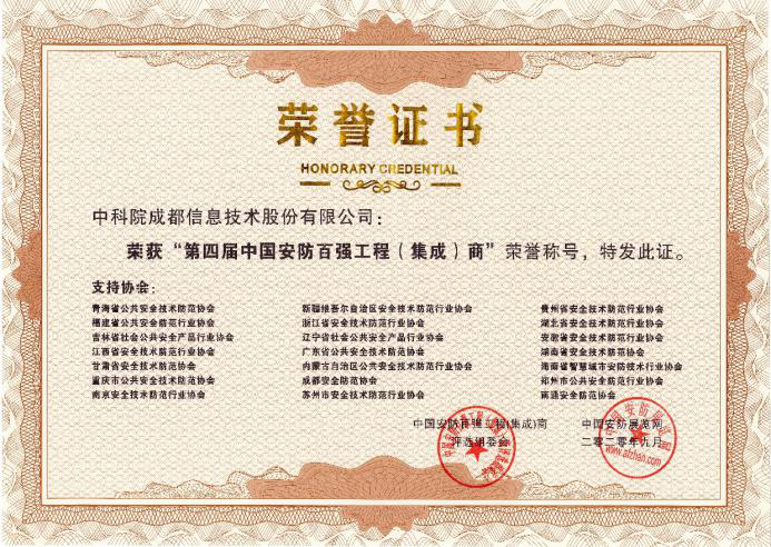 經(jīng)成都市安防協(xié)會初審推薦、組委會專家團終審和網(wǎng)絡公示,中科信息榮獲“第四屆中國安防百強工程(集成)商”稱號。四川省內共有三家企業(yè)獲此稱號。