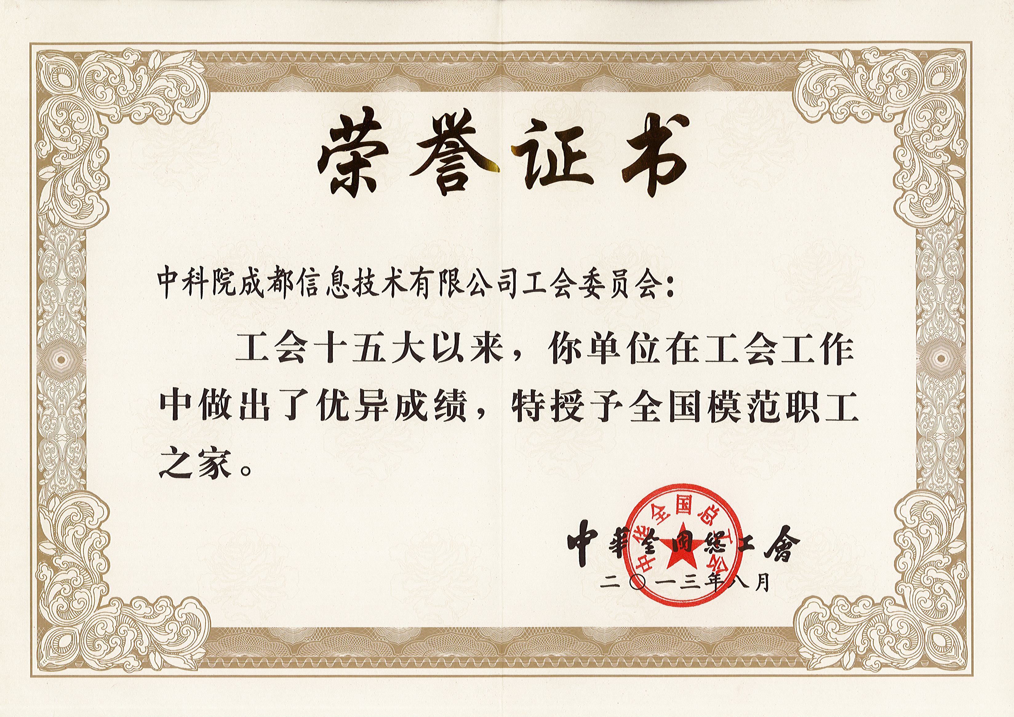 2013年,中科院成都信息技術股份有限公司被全國總工會授予“全國