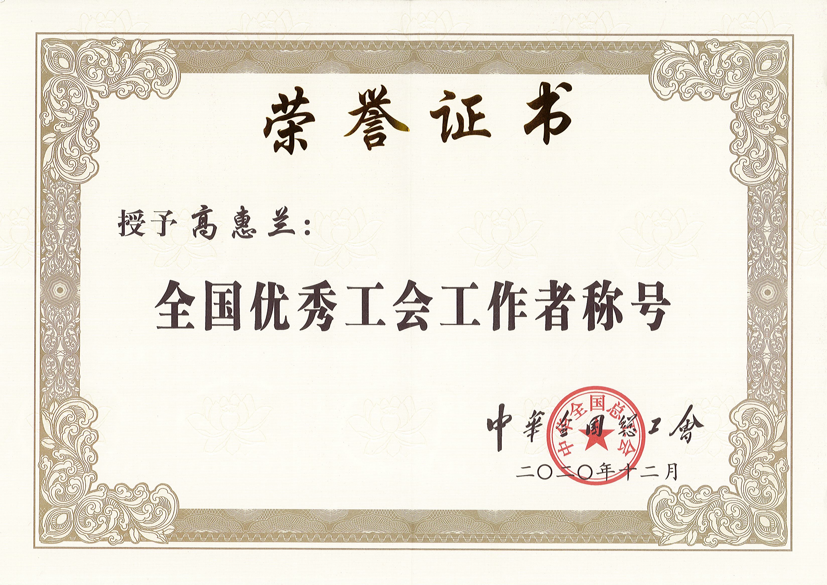 高惠蘭同志榮獲“全國優(yōu)秀工會工作者”榮譽