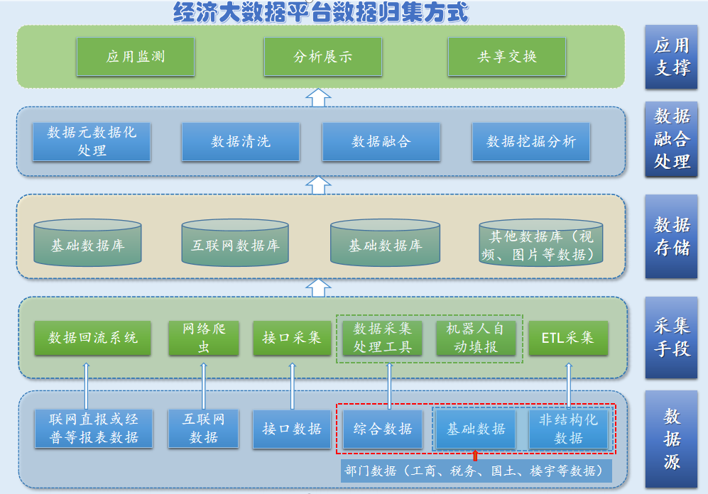 對(duì)歸集的數(shù)據(jù)進(jìn)行梳理、清洗形成能夠支撐經(jīng)濟(jì)運(yùn)行分析、挖掘和應(yīng)用的相關(guān)數(shù)據(jù)資源體系,并采用“集中管理、分布應(yīng)用”的數(shù)據(jù)管理模式,建立數(shù)據(jù)融合模型按數(shù)據(jù)映射將各類數(shù)據(jù)進(jìn)行融合,包括名錄數(shù)據(jù)融合、項(xiàng)目數(shù)據(jù)融合、專業(yè)數(shù)據(jù)融合、部門數(shù)據(jù)融合、互聯(lián)網(wǎng)數(shù)據(jù)融合