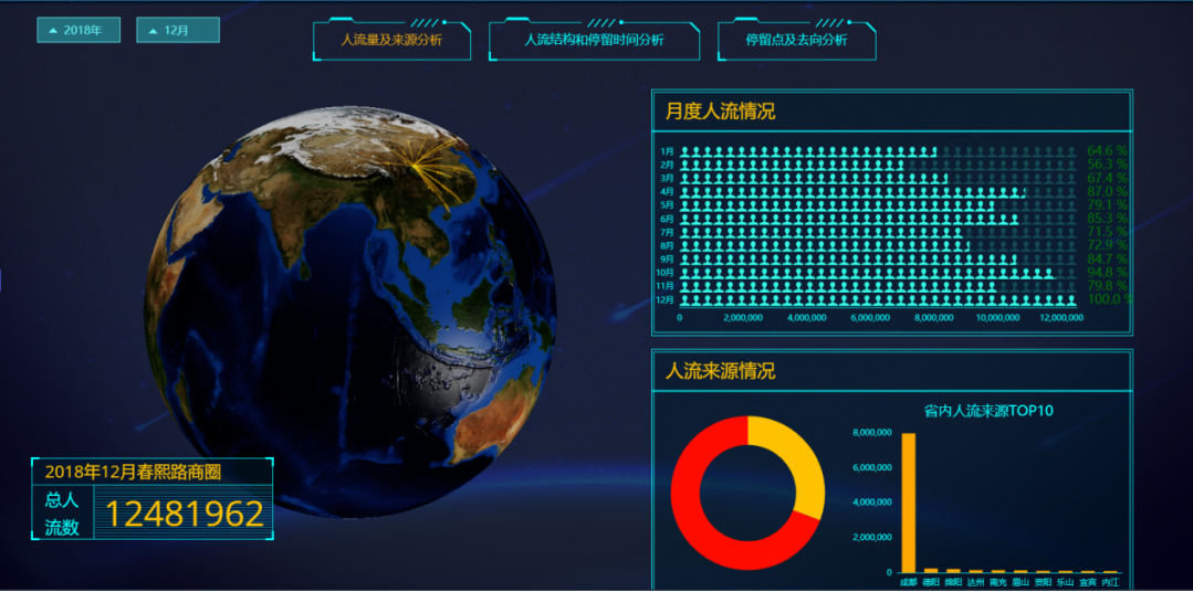 運(yùn)用人口數(shù)據(jù)對(duì)區(qū)域內(nèi)商圈進(jìn)行人流量、來(lái)源、人流結(jié)構(gòu)、停留點(diǎn)和停留時(shí)間等分析展示,監(jiān)測(cè)宏觀經(jīng)濟(jì)和微觀經(jīng)濟(jì)的發(fā)展趨勢(shì)與活力,從而助力產(chǎn)業(yè)創(chuàng)新、經(jīng)濟(jì)發(fā)展。