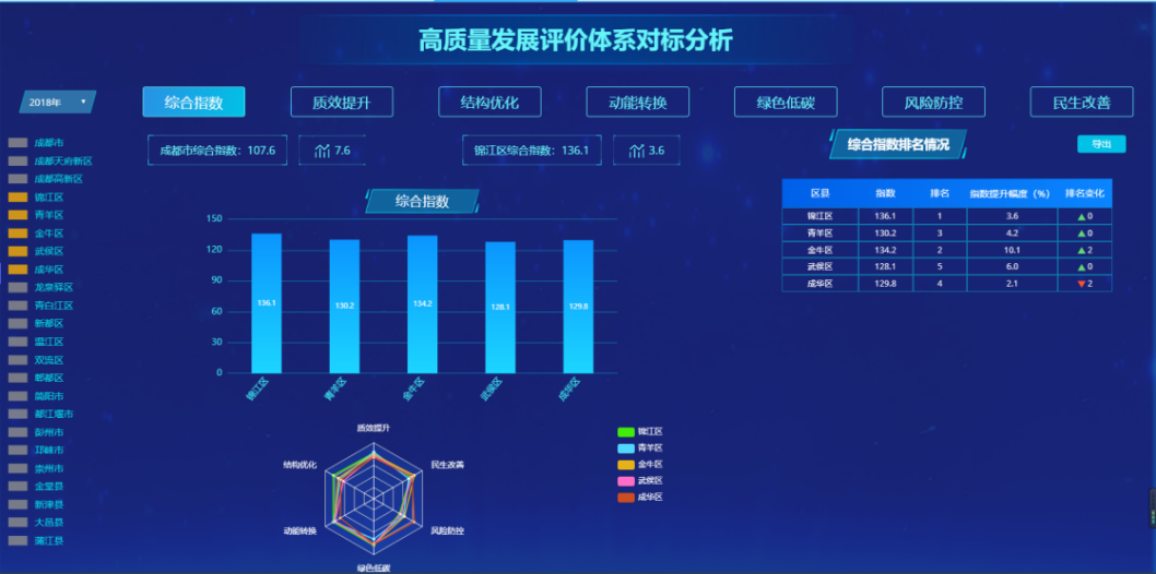 主要對(duì)區(qū)域內(nèi)主導(dǎo)產(chǎn)業(yè)、高質(zhì)量指標(biāo)評(píng)價(jià)體系進(jìn)行分析。按照產(chǎn)業(yè)、行業(yè)和樓宇劃分統(tǒng)計(jì)對(duì)象,整合經(jīng)普數(shù)據(jù)、“四上企業(yè)”數(shù)據(jù)形成主導(dǎo)產(chǎn)業(yè)信息庫(kù)和樓宇經(jīng)濟(jì),并從質(zhì)效提升、結(jié)構(gòu)優(yōu)化、動(dòng)能轉(zhuǎn)換、綠色低碳、風(fēng)險(xiǎn)防控、民生改善六個(gè)維度對(duì)地方高質(zhì)量發(fā)展指標(biāo)評(píng)價(jià)體系分析展示,對(duì)區(qū)域內(nèi)產(chǎn)業(yè)結(jié)構(gòu)、資源載體、高質(zhì)量發(fā)展定量分析與判斷。