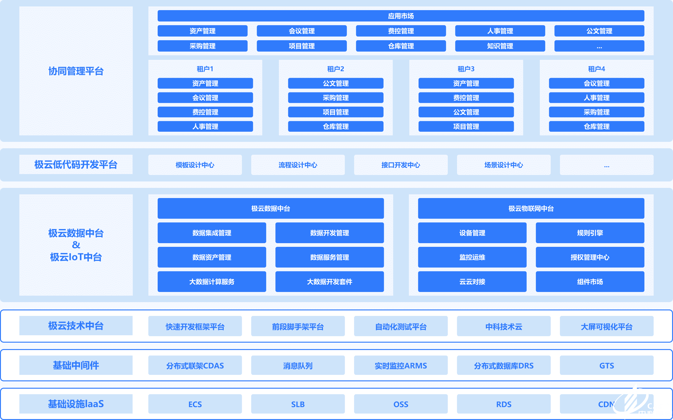 中科極云平臺是一款具有完全自主知識產(chǎn)權的企業(yè)級通用服務開發(fā)平臺,包括:極云協(xié)同管理平臺、極云低代碼開發(fā)平臺、極云數(shù)據(jù)中臺、極云物聯(lián)網(wǎng)中臺和極云技術中臺,是由中科院成都信息技術股份有限公司基于多年面向行業(yè)化的軟件工程、軟件平臺、軟件開發(fā)技術的研究應用沉淀整合而來。平臺采用微服務、云計算、大數(shù)據(jù)、流程引擎、統(tǒng)一認證等先進技術,提供常用的軟件開發(fā)框架及組件庫,將軟件信息化需求抽象成標準的流程、數(shù)據(jù)模型,采用低代碼可視化配置開發(fā)的方式,提供了支持跨平臺的通用軟件開發(fā)能力。