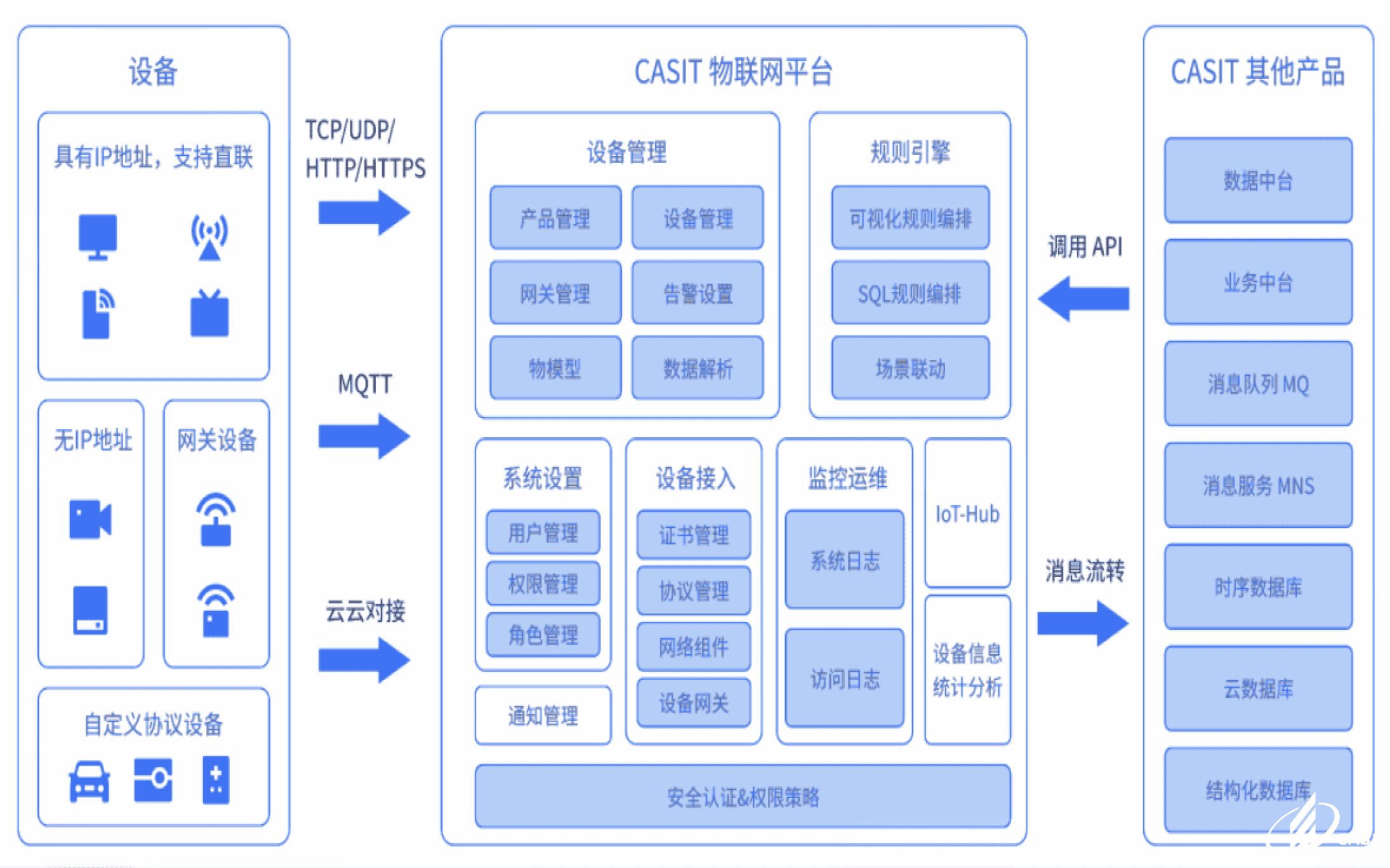 極云物聯(lián)網(wǎng)中臺是一個企業(yè)級物聯(lián)網(wǎng)基礎開發(fā)平臺,可實現(xiàn)物聯(lián)網(wǎng)業(yè)務開發(fā)的眾多基礎功能,幫助企業(yè)快速建立物聯(lián)網(wǎng)相關業(yè)務系統(tǒng)。平臺集成了設備管理、數(shù)據(jù)安全通信和消息訂閱等能力,向下支持海量設備連接,采集設備數(shù)據(jù)上云;向上提供云端API,服務端可通過調(diào)用云端 API 將指令下發(fā)至設備端,實現(xiàn)遠程控制;除此以外,平臺還提供規(guī)則引擎等功能。其中,設備接入與管理支持億級設備與云端建立安全可靠的雙向連接;可視化規(guī)則引擎提供設備與云上各產(chǎn)品之間的數(shù)據(jù)流轉(zhuǎn)。從而幫助用戶快速搭建垂直物聯(lián)網(wǎng)架構,高效實現(xiàn)場景化智能應用。