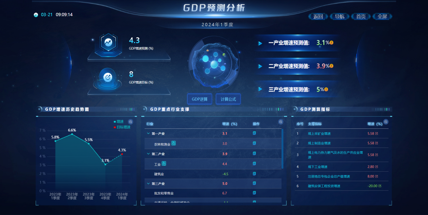 按照GDP核算體系結合相關內置的科學模型,針對下個周期的經(jīng)濟運行走勢(重點經(jīng)濟指標)進行預測及研判,并通過經(jīng)濟運行智慧調度平臺對初步的走勢結果進行調度分析與目標任務的分解下發(fā),真正實現(xiàn)經(jīng)濟調度“智能化”。