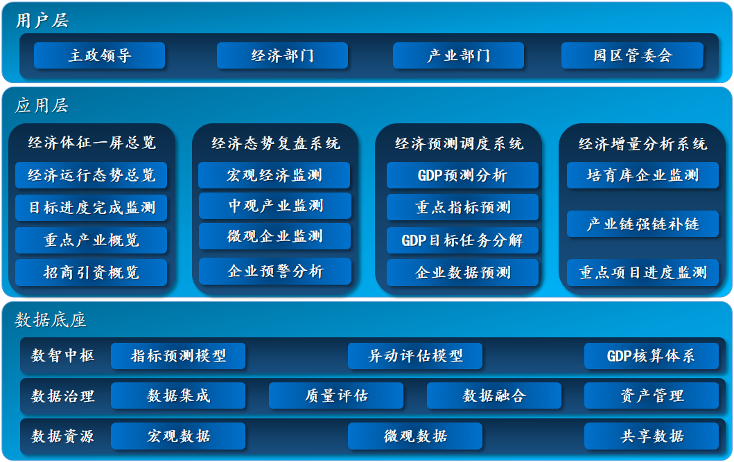 針對傳統(tǒng)的經(jīng)濟運行調度會無法科學、直觀和深入分析經(jīng)濟形勢、對經(jīng)濟指標監(jiān)測和研判缺少相關信息化手段支撐的需求,通過多維度對比、多元化預測算法模型、多層次數(shù)據(jù)深入挖掘方式,圍繞地方政府經(jīng)濟治理,實現(xiàn)經(jīng)濟運行分析調度會決策科學化、信息精確化和數(shù)據(jù)直觀化。