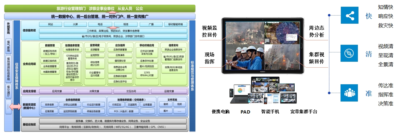 立足文旅行業(yè)日常監(jiān)管及應急管理的工作需要,建成具有日常監(jiān)管、信息接發(fā)、應急預案管理、應急處置、圖像接入和應急指揮功能的綜合性應用平臺,構建“景區(qū)實時監(jiān)控”、“旅行團隊實時監(jiān)管”、“應急指揮通訊互聯互通”等場景,實現多級監(jiān)測預警及應急聯動應用,做到應急“看得見、聯得上,呼得應”。