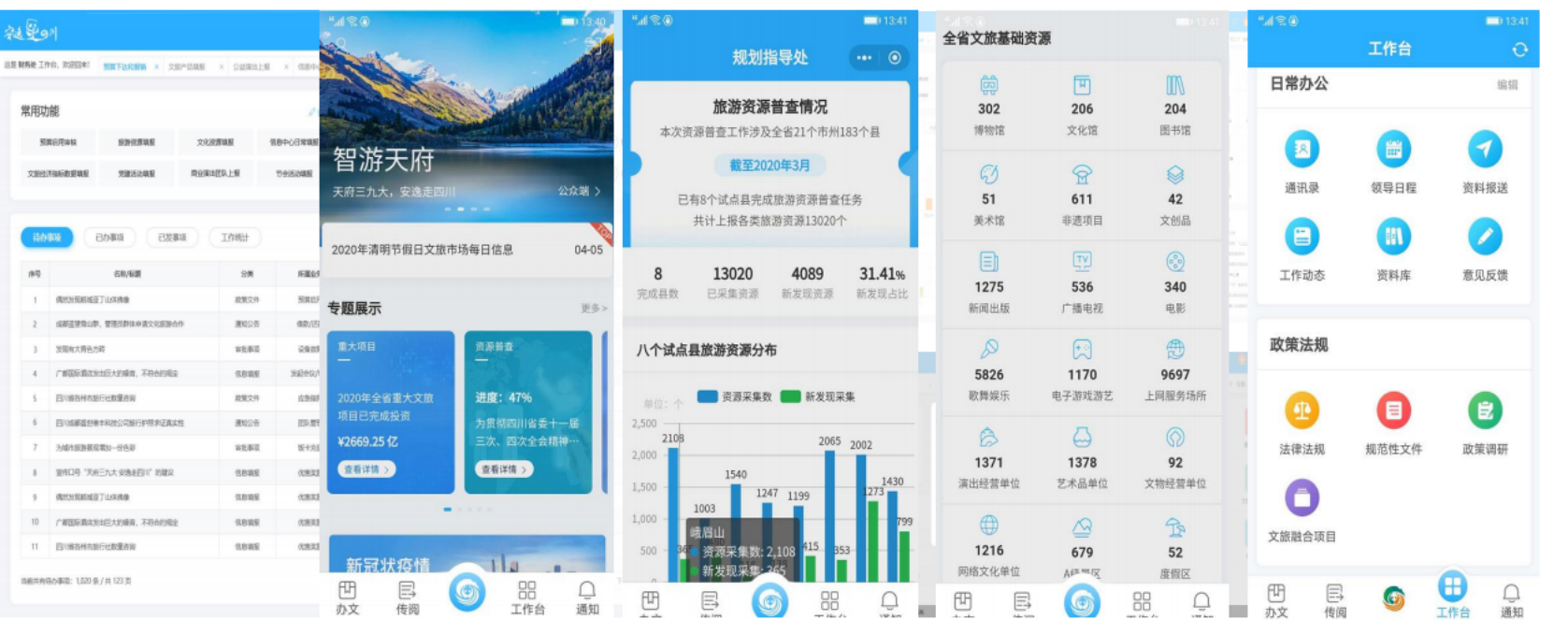 以文旅主管部門各科室、領導實際業(yè)務需求為導向,以各科室實際業(yè)務系統為支撐,打造含20+個科室日常工作應用,50+個應用模塊,300+個功能點的APP可視化管理,構建覆蓋全面、功能完善、運轉高效、方便快捷的掌上管理“總樞紐”,助力政務工作高效化開展。
